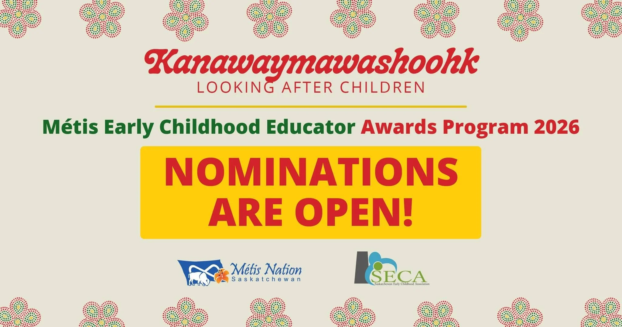 Métis Nation–Saskatchewan, in partnership with the Saskatchewan Early Childhood Association (SECA), is now accepting nominations for the Kanawaymawashoohk (“Looking After Children”) Métis Early Childhood Educator Awards.